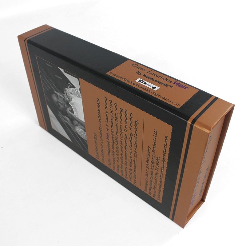 Our custom hair extension packaging is designed to make a lasting impression on your customers and enhance your brand image. The magnetic closure provides convenience and security, while the use of two custom Pantone colors, complemented by black, creates a sophisticated and eye-catching packaging design that reflects your brand identity.