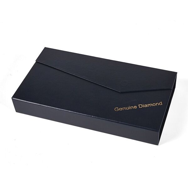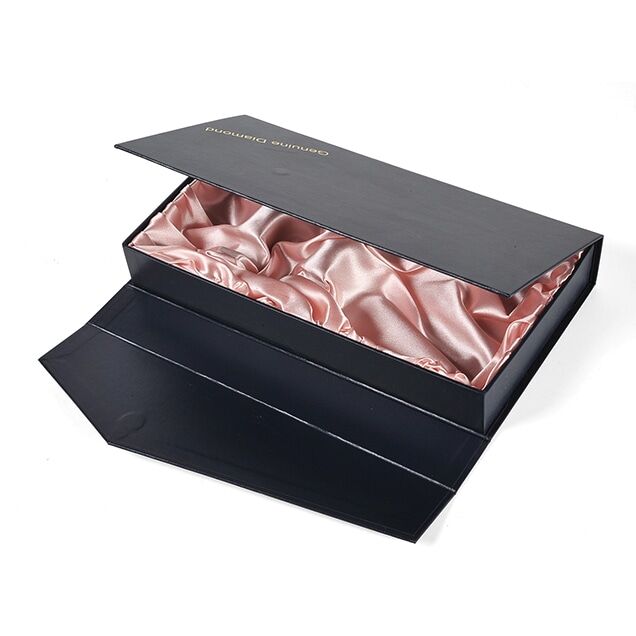 Our custom magnetic packaging box features a special design with two flaps that make it stand out from traditional magnetic closure boxes. Crafted with sleek black fancy paper, the box exudes luxury.